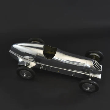 A wonderful tether car model produced by E & M (The Experimental and Model Co.) of Coventry with engine and ‘Maserati style' bodywork and radiator grill. This particular model is in excellent condition and is deeply reminiscent of the heyday of the race cars of the 1950’s. The rear wheels run free on an axle that is pivoted in the middle to allow the car to 'steer'. The car was originally available as a kit that would need to be assembled. Tether Cars are model racing cars powered by miniature internal combustion engines. Tether car racing started in California in the late 1930’s. A 'cable track' race car, such as this, was attached to a central post by a steel cable in such a manner that they are able to repeatedly run around a circular track. The cars race individually and the winner is determined based on average speed of several laps. Once the timed laps are completed, the car is typically stopped by a 'kill switch' that extends from the car so it can be triggered as the car passes by; the owner using a pole, broom or rag to activate the switch. Alternatively the car is simply allowed to run until it is out of fuel. Early engines (prior to the 1950s) had spark ignition systems. Later engines use compression ignition engines or glow plug ignition. A 'glow plug' engine, or glow engine, is a type of small internal combustion engine typically used in model aircraft, model cars and similar applications. Glow engine fuel generally consists of methanol with varying degrees of nitromethane content. Compression ignition engines run on diesel.